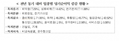 이어 섬유의복이 14.42% 증가했고 전기전자는 11.88%의 성장세를 보였다. 의료정밀과 전기가스업은 흑자전환한 반면에 종이목재(71.95%), 화학(46.28%), 유통업(45.77%), 철강금속(42.52%) 통신업(28.92%), 음식료품(5%), 운수장비(2.08%), 서비스업(0.38%) 등은 감소했다.