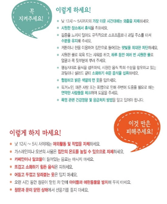 보건당국이 당부하는 폭염기 건강수칙은 △식사는 가볍게, 충분한 양의 물 섭취 △땀을 많이 흘렸을때 스포츠음료 등으로 염분·미네랄 보충 △헐렁하고 가벼운 옷 입기 △주정차된 차안에 어린이·애완동물 두지 않기 △카페인·알코올 음료 피하기 등이다.