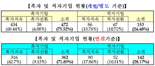 이는 개별기준 실적으로도 크게 다르지 않다. 개별기준 상장사 625사 중 153사(24.9%)가 순이익 적자를 기록했다. 특히 순이익 상위 20사 중 삼성전자 등 7사를 제외한 13사의 순이익이 모두 하락했다.