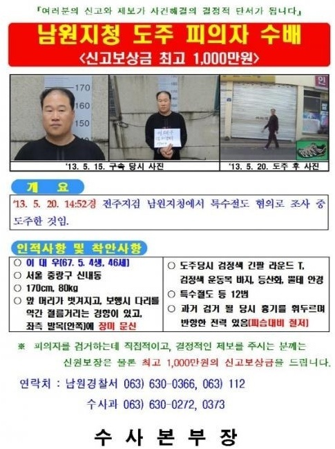 탈주범 이대우가 1주일전 서울 종로 인근에서 지인을 만난 것으로 확인돼 경찰이 긴급 수색을 벌이고 있다. 경찰의 '뒷북 수사'에, 시민들은 불안해하고 있다. 이대우는 도주 당시 수갑을 찬 채 달아난 뒤 2주 넘게 경찰의 검거망을 피해다녀 ‘제2의 신창원’이란 별명까지 얻었다.