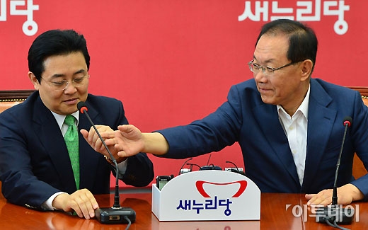 새누리당 황우여 대표가 1일 서울 여의도 국회 당대표실에서 민주당 전병헌 원내대표를 접견해 마이크 높이를 조정해주고 있다. 양지웅 기자 yangdoo@