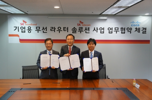 ▲송기익 SK브로드밴드 ICT사업본부장(오른쪽부터), 이문철 시스코코리아 부사장, 조승원 SK텔레콤 기업사업3본부장이 SK남산빌딩에서 ‘기업용 무선 라우터 솔루션’에 관한 양해각서를 체결 후 기념촬영을 하고 있다.