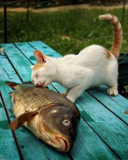 이 사진에는 고양이가 생선에 얼굴을 대고 누워 세상을 다 가진 듯한 표정을 짓고 있어 웃음을 자아낸다.