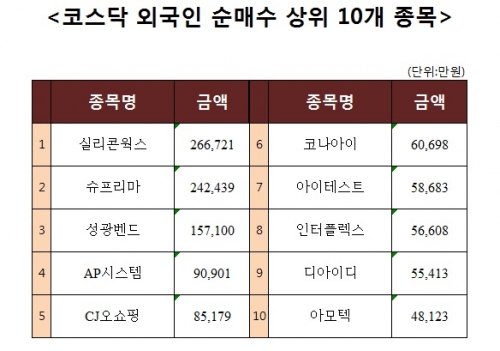 [코스닥 외국인 순매수 상위 10개 종목]