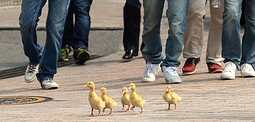 3일 서울 중구 명동 거리에 등장한 새끼오리 5마리가 거리를 걸어 다니자 사람들이 뒤를 따르고 있다.