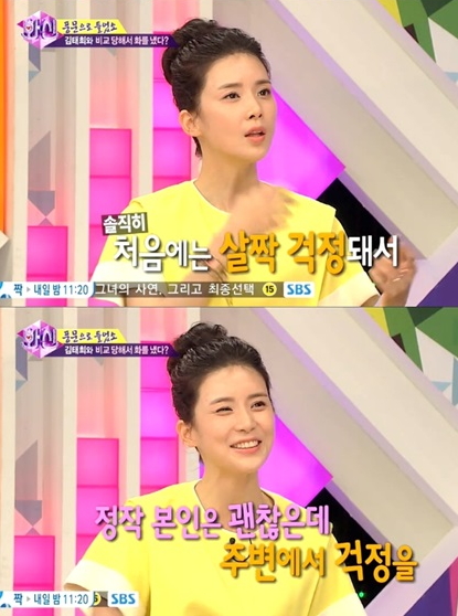 이보영은 "혼자서 밥을 먹을 수도 있지 않나"라고 말하며 "김태희 루머 역시 주변 사람들에게 같이 광고 찍어도 될지 조언을 구한 것 뿐"이라고 해명했다.