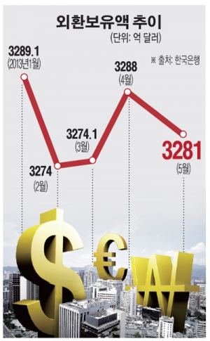 5일 한국은행이 발표한 '2013년 5월말 외환보유액'에 따르면 지난달 말 우리나라의 외환보유액은 3281억 달러로 전월에 비해 7억 달러 감소했다.