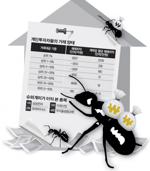 슈퍼개미들은 평균 7개 종목을 반복적으로 거래했고 약 이틀에 한 번꼴로 주식을 사고 팔았다. 이들 계좌는 3만8925개, 누적 거래대금은 계좌당 평균 246억8000만원 수준이었다.