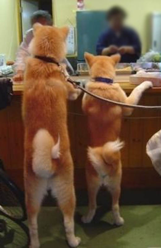 해당 사진 속에는 강아지 두 마리가 나란히 카운터에 서서 뭔가를 주문하는 듯한 자세를 취하고 있다. 특히 큰 강아지와 작은 강아지의 똑같은 뒤태가 웃음을 자아낸다.