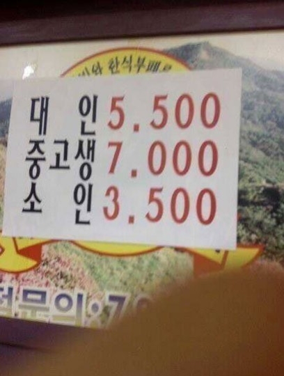 사진 속에는 뷔페 가격표가 나와 있다. 이 뷔페의 가격은 일반 뷔페와 다르다. 보통 대인ㆍ중고생ㆍ소인 순으로 가격이 책정되지만, 이 뷔페는 중고생의 가격이 가장 비싸다. 성장기 중고생이 일반 성인보다 식욕이 왕성하다는 점을 고려해 가격을 매긴 것이다.