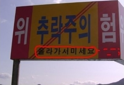 간판에는 '추락주의 위험'이라는 경고 문구가 담겨있다. 하지만 경고 문구 바로 아래는 '올라가서 미세요'라는 문장이 함께 써있다. '올라가지 마세요'라는 문구가 변형돼 이러한 섬뜩한 의미가 된 것으로 보인다.