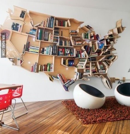 공개된 '미국인의 책장' 사진에는 벽에 걸린 거대한 책장이 보인다. 특이한 점은 책장의 모양이 미국 지도를 모양을 닮았다는 것이다.