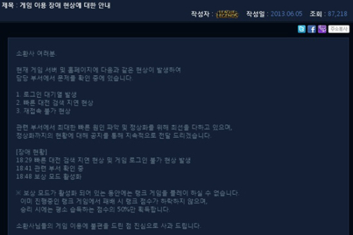 롤을 운영하는 라이엇게임즈는 6일 공식 홈페이지를 통해 '대기열 지연시 진입 불가' 장애 공지를 띄었다. 이어 "이미 매칭이 진행되고 있었을 경우에는 기존과 동일하게 매칭이 이루어지지만 다시 대기열에 진입하실 수 없으니 매칭이 진행 중일 경우 취소하지 마시고 그대로 진행"하라고 덧붙였다. 점검시간은 오후 1시부터 자정까지다.