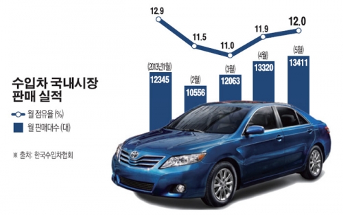 수입차 성장세가 매섭다. 5월 국내 승용차 시장에서 수입차는 모두 1만3411대가 팔려 최대 판매 기록을 한 달 만에 갈아치웠다. 특히 지난해 3월부터 15개월 연속 ‘월 1만대 판매’를 달성했다.