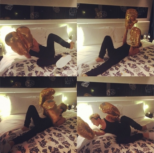 공개된 사진 속 지드래곤은 커다란 금색 글러브를 착용한 채 침대에서 권투 포즈를 취하는 모습을 하고 있다. 특히 지드래곤은 혼자 펀지를 날렸다가 막아내는 포즈를 취하기도해 혼자 놀기의 진수를 보이는 듯해 눈길을 끈다.