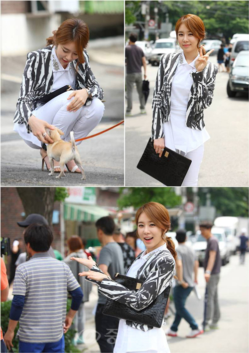 공개된 사진 속 유인나는 패턴이 있는 재킷과 화이트 팬츠를 매치해 세련된 룩을 선보였다. 특히 유인나는 강아지를 보고 밝게 웃느 모습이 보는이를 흐뭇하게 만든다.