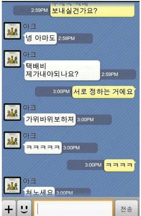 해당 사진은 카카오톡 메신저의 대화내용으로 누가 택배비를 부담해야 할지에 대해 이야기를 나눈 내용이 담겨있다. 이 사연은 중고물품을 구입하기 위해 중고거래 사이트에 글을 올렸다가 발생된 내용으로 택배비를 서로 정해야 한다는 발신인의 말에 수신인은 가위바위보로 정하자고 제안하고 있는 상황이다.