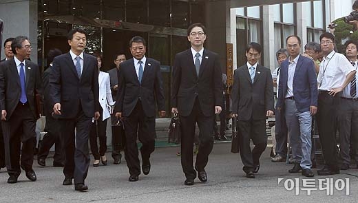 판문점에서 열리는 남북 장관급 회담을 위한 실무접촉 수석대표인 천해성 통일부 통일정책실장(오른쪽 네번째)과 대표단이 9일 오전 서울 종로구 삼청동 남북회담본부를 나서고 있다. 방인권 기자 bink7119@