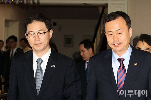 김남식 통일부 차관(오른쪽)과 판문점에서 열리는 남북 장관급 회담을 위한 실무접촉에 참석하는 실무접촉 수석대표인 천해성 통일부 통일정책실장이 9일 오전 서울 종로구 삼청동 남북회담본부에서 환담을 갖기 위해 들어서고 있다. 방인권 기자 bink7119@