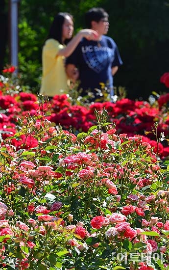 9일 오후 서울 송파구 방이동 올림픽공원 장미광장 일원에서 열리는 장미축제를 찾은 시민들이 장미꽃과 함께 즐거운 시간을 보내고 있다. 장미축제는 오는 11일까지 계속된다. 방인권 기자 bink7119@
