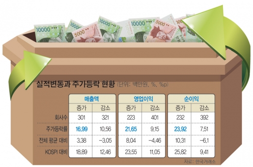 영업이익이 증가한 223개사의 주가는 평균 21.65% 올랐고 매출액이 늘어난 301개사 주가는 16.99% 상승했다. 같은 기간 코스피는 1.90% 하락했다.
