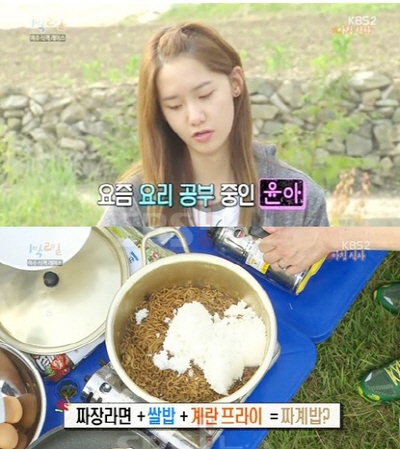 이날 방송에서 윤아는 멤버들을 위해 아침을 직접 준비했다. 윤아가 선보인 음식은 바로 '짜계밥'. 최근 MBC '일밤-아빠 어디가'에서도 등장해 화제를 모은 짜장라면을 이용한 요리인 것. 짜계밥은 짜장라면, 쌀밥, 계란프라이가 더해져 완성됐다.
