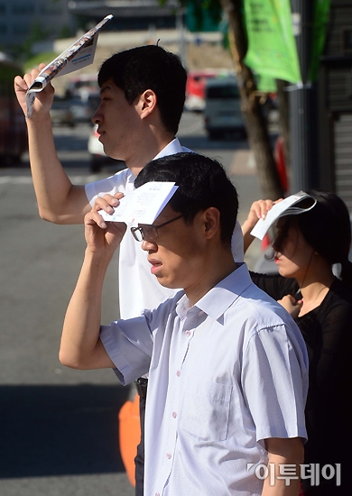 한여름에 들어선 듯한 무더위가 계속되고 있는 10일 오전 서울광장 인근에서 시민들이 뜨거운 태양을 가리며 신호를 기다리고 있다. 노진환 기자 myfixer@