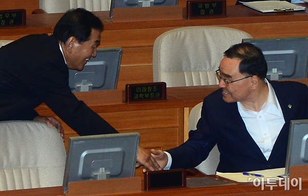 정홍원 국무총리와 이재오 새누리당 의원이 10일 오전 국회에서 열린 제316회 국회 임시회 4차 본회의에 참석해 정치분야 대정부질문에 앞서 악수를 하고 있다. 노진환 기자 myfixer@