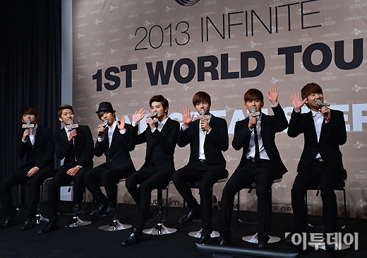 그룹 인피니트가 10일 서울 강남구 청담 씨네시티 엠큐브에서 'One Graet Step' 월드투어 기자회견을 가졌다. 이날 기자회견에 참석한 인피니트가 포즈를 취하고 있다. 양지웅 기자 yangdoo@