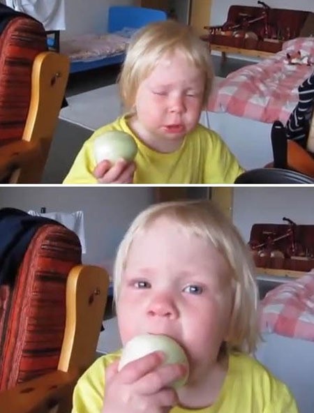 해당 영상에는 울면서 생양파를 먹는 아기의 모습이 담겨 있다. 아기가 눈물을 뚝뚝 흘리면서도 양파를 맛있게 먹는 모습이 보는 이로 하여금 웃음을 자아내고 있다.