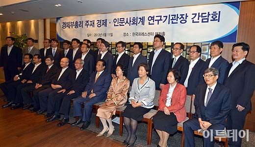 현오석 경제부총리 겸 기획재정부 장관이 11일 오전 서울 중구 프레스센터에서 열린 ‘경제ㆍ인문ㆍ사회계 연구 기관장 간담회’에 앞서 참석자들과 기념촬영을 하고 있다. 방인권 기자 bink7119@