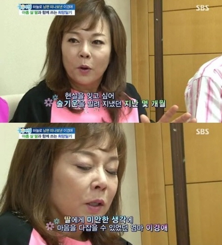 이경애는 "알코올 분해효소가 없어서 술을 못 먹는데 요즘 내가 50년 동안 마신 술보다 최근 더 많이 먹었다. 악으로 깡으로 먹고 기절했다"며 "술 생각이 가끔 나는데 아이를 생각하면 미안해서 마음을 다 잡았다"고 말했다.