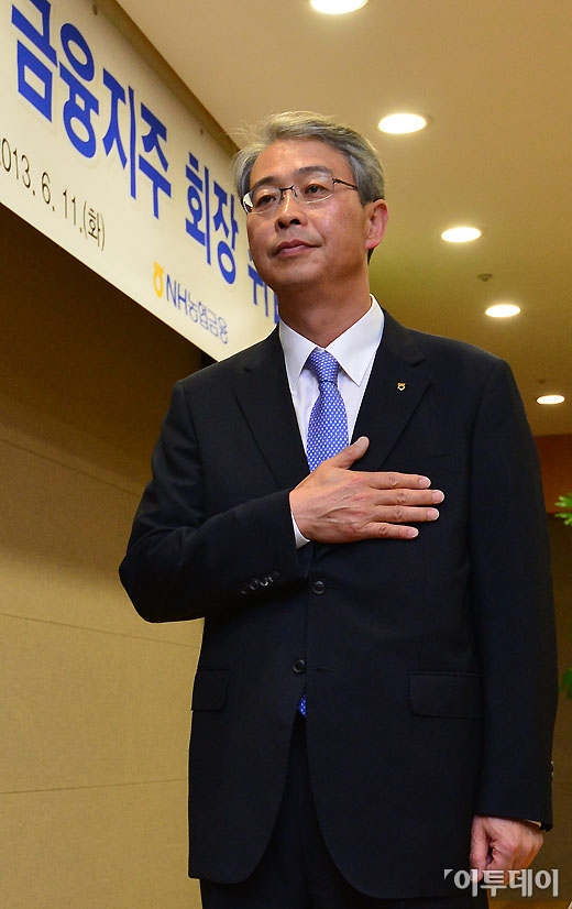 임종룡 농협금융지주 회장이 11일 서울 서대문 농협 본사에서 취임식을 가졌다. 이날 취임식에서 임 회장이 국민의례를 하고 있다. 양지웅 기자 yangdoo@