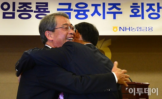 임종룡 농협금융지주 회장이 11일 서울 서대문 농협 본사에서 취임식을 가졌다. 이날 취임식에서 임 회장이 김태영 부회장과 포옹을 나누고 있다. 양지웅 기자 yangdoo@