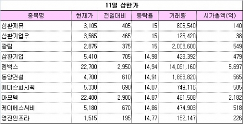 11일 한국거래소에 따르면 유가증권 4개, 코스닥 6개 등 총 10개 종목이 상한가로 마감했다.