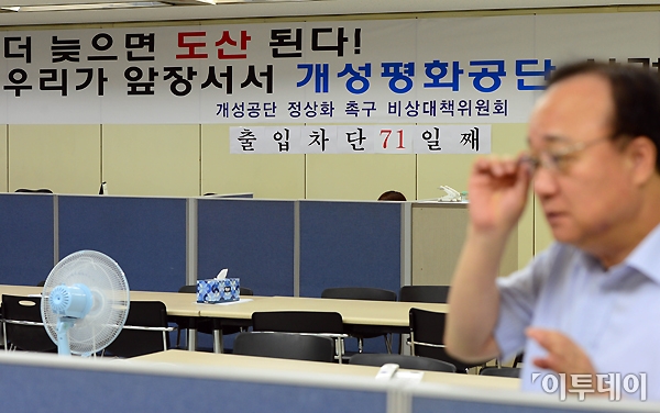 개성공단 출입차단 71일째인 12일 오전 여의도 개성공단 정상화 촉구 비상대책위원회에서 관계자가 심각하게 이야기를 나누고 있다. 오늘 열릴 예정이던 남북당국회담은 수석대표의 격(格)을 두고 대립한 가운데 북측이 대표단 파견 보류를 통보하면서 회담이 무산됐다. 노진환 기자 myfixer@