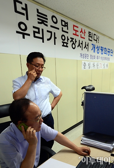 개성공단 출입차단 71일째인 12일 오전 여의도 개성공단 정상화 촉구 비상대책위원회에서 관계자들이 심각하게 통화를 하고 있다. 오늘 열릴 예정이던 남북당국회담은 수석대표의 격(格)을 두고 대립한 가운데 북측이 대표단 파견 보류를 통보하면서 회담이 무산됐다. 노진환 기자 myfixer@