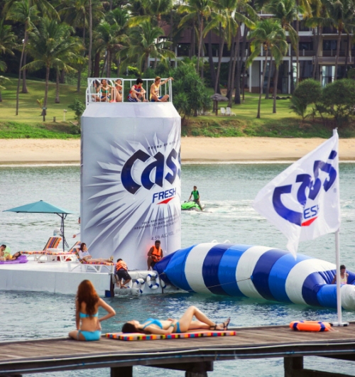 국내 대표 맥주 브랜드다운 큰 스케일과 역동적인 젊음을 표현해온 오비맥주는 이번 광고를 위해 열대 기후의 나라 태국 라용 해변가를 찾았다. 바닷가 한가운데에 약 5m 높이의 카스캔을 설치하고 주변에 병뚜껑 모양의 바지선과 바나나 보트 형태의 대형 에어메트 등을 설치해 보는 이들로 하여금 ‘카스 아일랜드’를 연상케 한다.