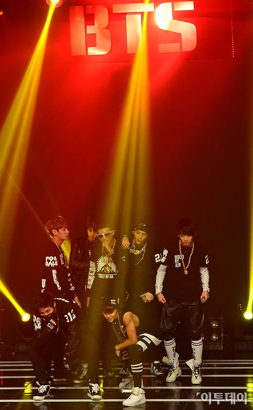 힙합 아이돌 방탄소년단(랩몬스터, 슈가, 진, 제이홉, 지민, 뷔, 정국)이 12일 서울 청담동 일지아트홀에서 데뷔 싱글 발매와 함께 쇼케이스를 열였다. 이날 쇼케이스에서 방탄소년단이 화려한 데뷔무대를 선보이고 있다. 양지웅 기자 yangdoo@