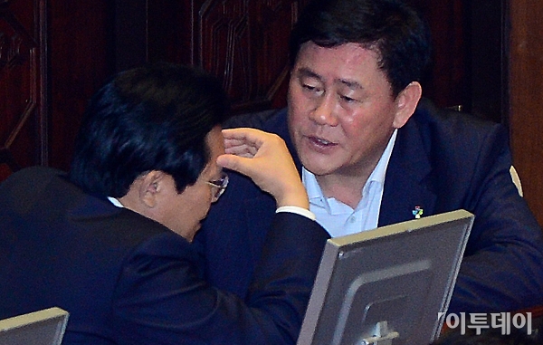전병헌 민주당 원내대표와 최경환 새누리당 원내대표가 12일 국회 본회의장에서 열린 경제분야 대정부질문에서 이야기를 나누고 있다. 노진환 기자 myfixer@