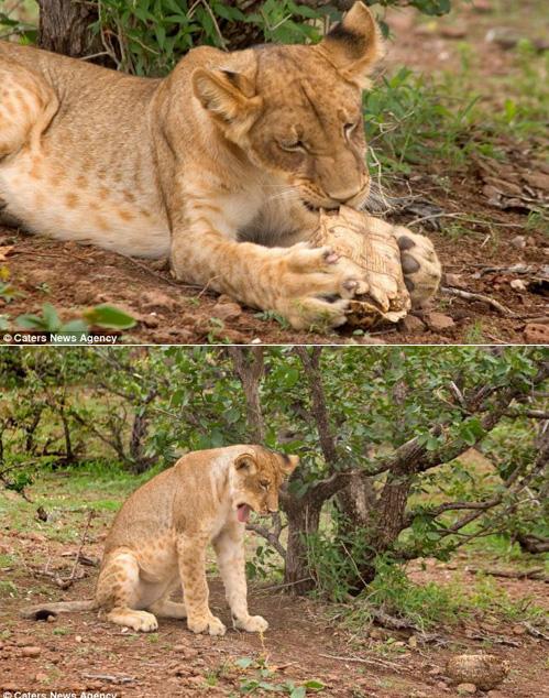 사진 속에는 새끼 사자 한마리가 자신 앞으로 기어온 ‘간식’을 포기하는 재미있는 순간이 담겨있다. 그 간식은 다름 아닌 거북이로 위기감을 느낀 거북이가 방어태세에 돌입하자 새끼 사자가 잡아먹기를 포기해 눈길을 끈다.