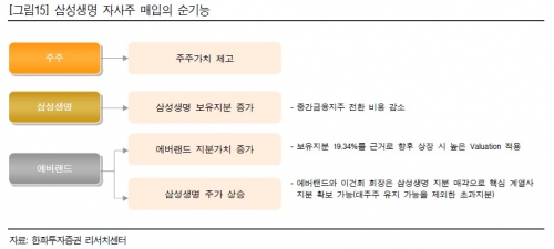 이어 “자사주 취득을 통해 삼성생명이 취할 수 있는 실질적 이익은 에버랜드 지분가치 재평가, 중간금융지주 전환 비용 감소, 에버랜드의 삼성계열사 지분 매입 자금 확보”라고 설명했다.