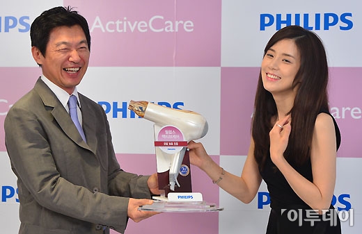 탤런트 이보영이 13일 오전 서울 용산구 이태원동 필립스전자 남산 본사에서 열린 ㈜필립스전자 신제품 ‘액티브케어’ 출시행사에서 김영진 필립스 부사장과 포즈를 취하고 있다. 양지웅 기자 yangdoo@
