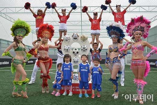 13일 오전 서울 용산구 아이파크몰 옥상 풋살경기장 추가 개장기념식에서 브라질 삼바 댄스팀이 대한민국 축구대표팀의 월드컵 본선 진출 기원 '삼바 댄스' 응원을 펼치고 있다. 방인권 기자 bink7119@
