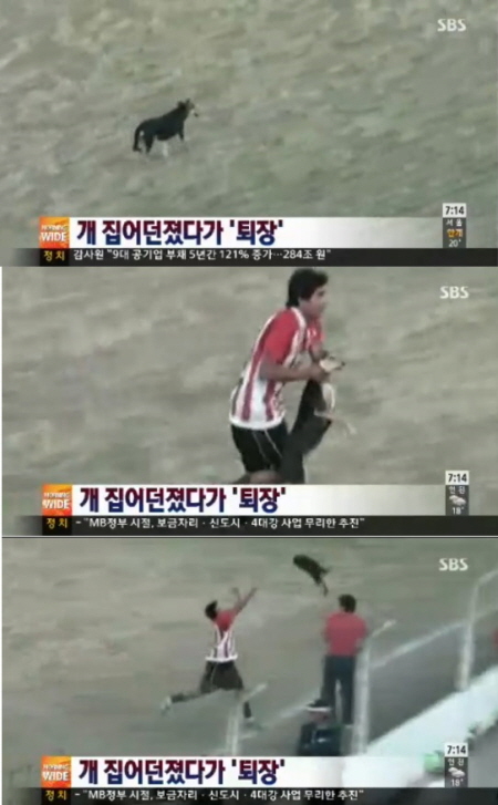 13일 SBS는 아르헨티나에서 축구 경기장에 들어온 개를 집어던진 축구선수가 격렬한 항의를 받고 경기장에서 쫓겨났다고 보도했다.
