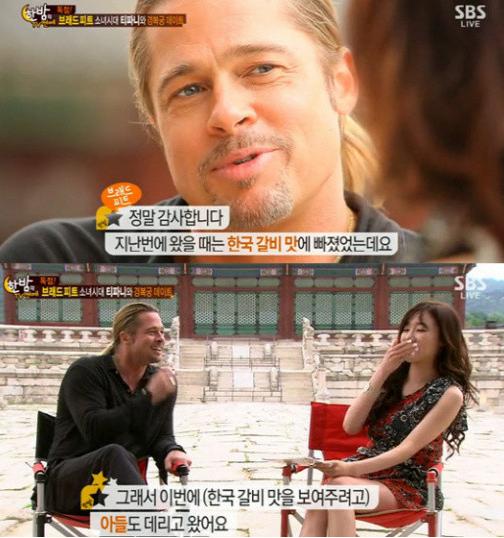 이날 방송에서 브래드 피트는 “지난번 왔을 때 한국의 갈비 맛에 빠졌었다”며 “그래서 이번에 (한국의 갈비 맛을 보여주기 위해) 아들을 데리고 왔다”고 밝혀 관심을 모았다. 또 브래드 피트는 한국 음식이 정말 최고라고 극찬을 했다.