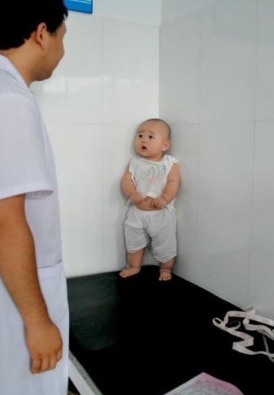 아기는 모퉁이에서 두 손을 가지런히 모은 채 주사를 놓지 말아달라는 듯한 애절한 표정을 짓고 있다.