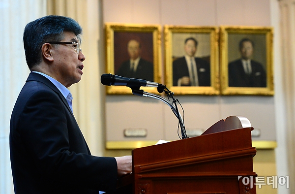 김중수 한국은행 총재가 14일 오전 남대문로 한국은행 별관에서 열린 창립 63주년 기념식에 참석해 기념사를 하고 있다. 노진환 기자 myfixer@