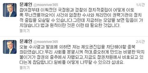 이어 “참여정부 때 이뤄졌던 국정원과 경찰의 정치적 중립이 어떻게 이토록 무너졌을까요”라면서 “이 사건의 엄정한 수사와 처리만이 권력기관의 정치적 중립을 되살릴 수 있는데, 지금 하는 모양을 보면 믿음이 가지 않으며, 법과 원칙이란 것이 이런 때 필요한 것”이라고 밝혔다.