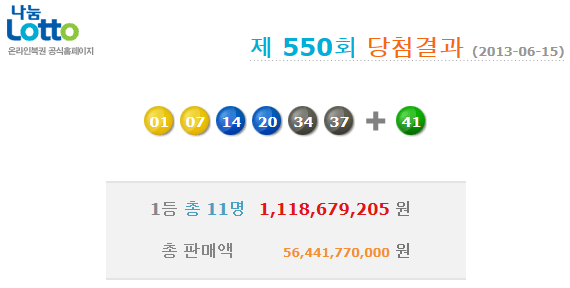 ▲로또 550회 당첨번호는 '1 7 14 20 34 37' 보너스번호 '41'이다.(사진=나눔로또 사이트 캡처)